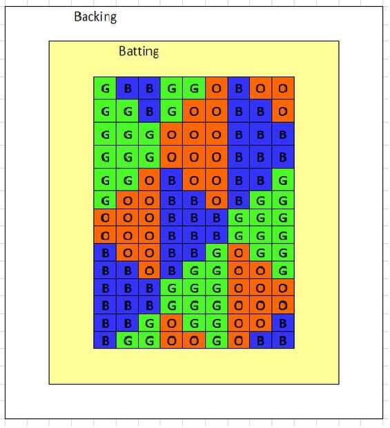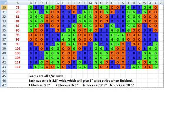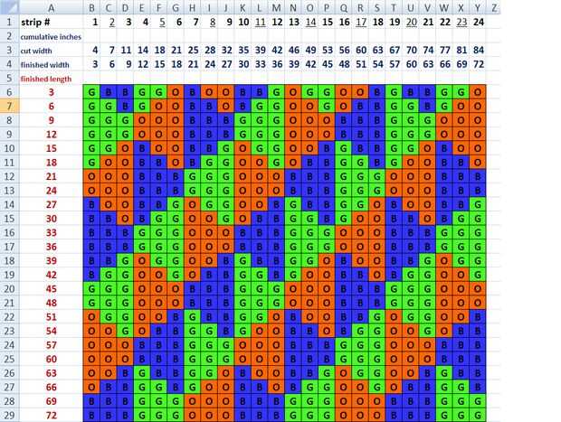 4. hacer un gráfico de la mantita en computadora usando un programa de hoja de cálculo, tiras de 3 cuadras para cada 3.5" tira larga, 2 cuadras de 6.5", a 4 cuadras de 12.5" tiras, 6 cuadras para las tiras de 18.5". Contar el número de 3.5", 6.5", 12.5 y 12.5" bloques necesitan para cada color y se nota esto en la parte inferior del gráfico.