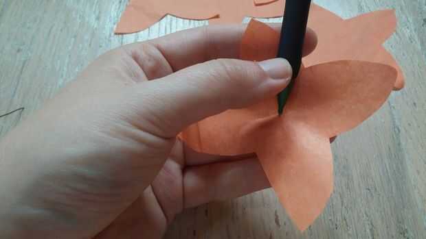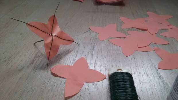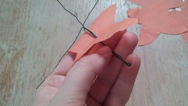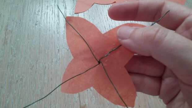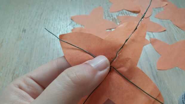 Hilo la espiga por el orificio. Alinee las secciones transversales con las puntas de los pétalos. Pro Tip: Si los cables están dobladas o no alinear correctamente con los puntos de pétalo, tomar la flor de papel de la madre antes de tratar de arreglar los cables. Papel de tejido se rasga fácilmente.