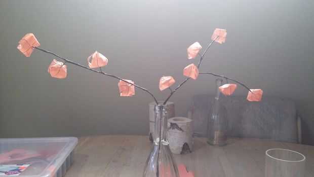 me encanta la forma de los cerezos fuera de mi edificio alegre floración cada primavera.  Quería traer la belleza de los cerezos en flor en el interior así que hice algunos de papel de seda y para hacerlos aún más especiales agregué LEDsEstas luces b