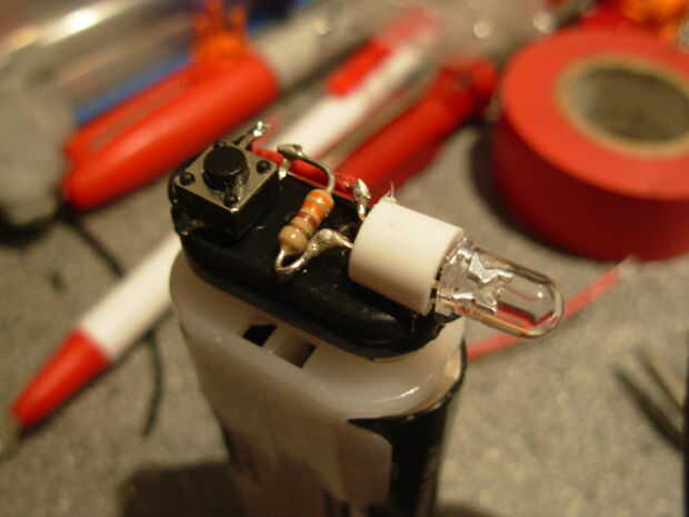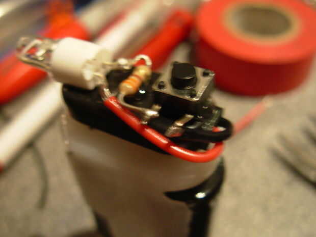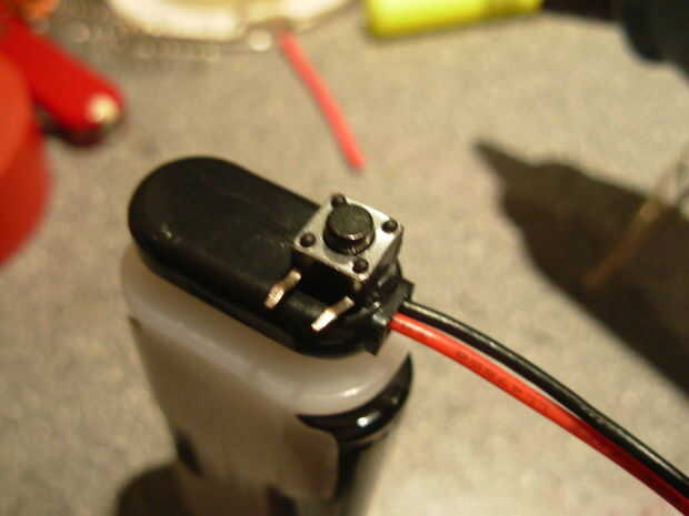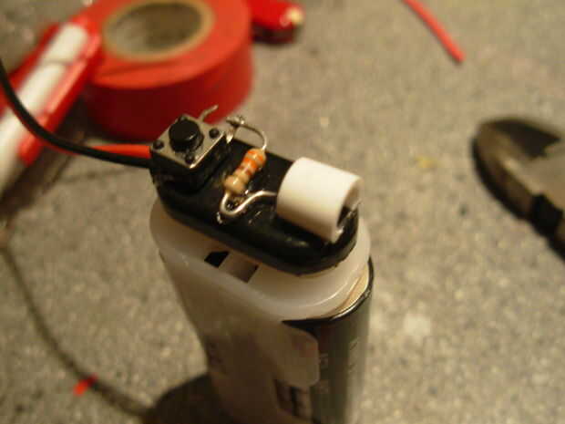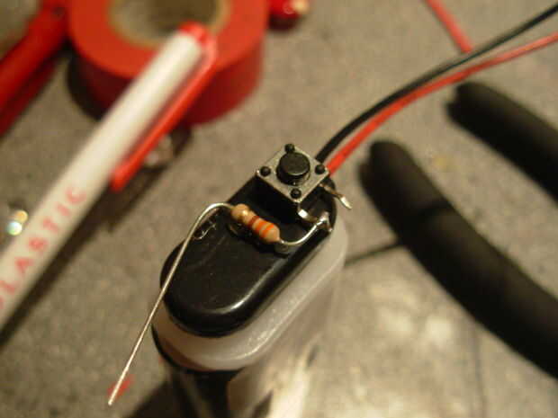 5. los cables de la pinza de 9 voltios a la longitud del clip y de la soldadura de uno para el interruptor y otro directamente al LED