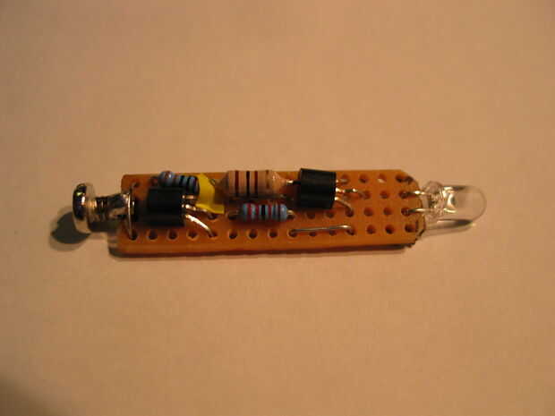 Investigando una paradoja:Recientemente, vi que un "ahorro energético" LED linterna para la venta y sólo utiliza un 1.5 voltios. He comprado esta luz y tomó aparte esperando encontrar una batería, bombilla, interruptor y algún tipo de circuito e