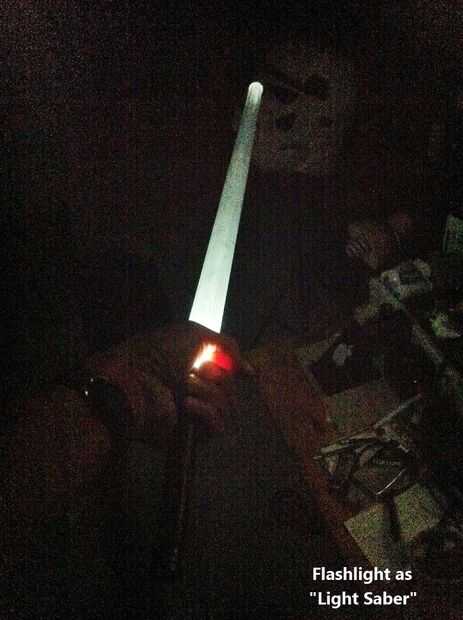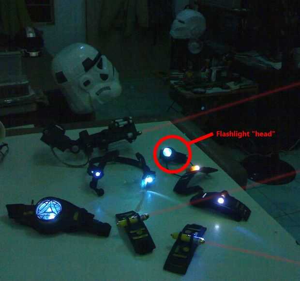 La linterna "cabeza" ya fue utilizado como un juguete en noviembre de 2013., he utilizado como un juguete "Repulsor de mano de hombre de hierro" como se ve en la imagen junto con un montón de apoyos de juguete de Iron Man hechos pasado noviembre 2013 para un niño (él desea ser un hombre de hierro)... También en la imagen es cuando convierto esta - misma linterna como una "espada sable de luz"... Lamentablemente no pude documentar alguno de los proyectos que se muestra a continuación...