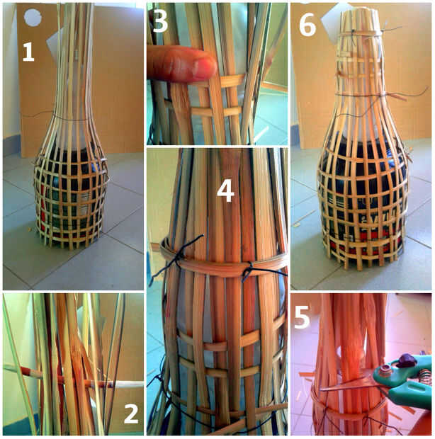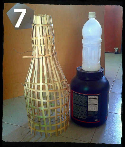 Felicitaciones para completar el proceso de tejido, permite ver el resultado presionando suavemente la botella desde la parte superior, posteriormente Esto empujará el contenedor fuera el esqueleto de bambú. Ver imagen 7 el resultado :)