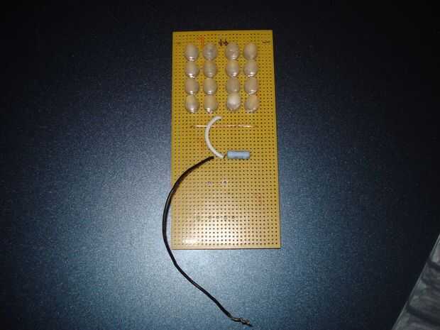 A continuación, instalar la resistencia de 10 ohmios por uno de sus extremos de conexión al grifo del positivo en el panel de LED. Si tienes perfboard, simplemente inserte la resistencia en los agujeros y conecte los cables por debajo. Si estás usando cartón, perfore los agujeros para los cables de la resistencia a través y hacer lo mismo. Después de configurar la resistencia, conecte un cable que sobresale de su conmutador a la pieza de alambre de cobre que une las dos derivaciones negativas. (Muy importante: no deje que lo positivo y negativo cables cruzan a menos que estén aislados)