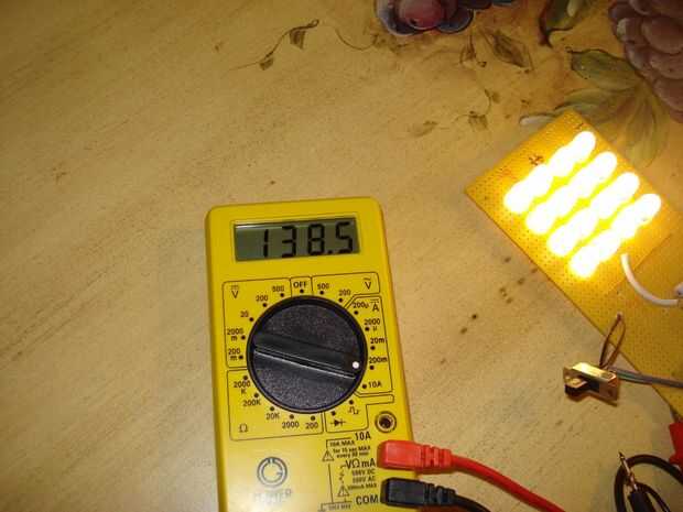 Conecté una punta de prueba de mi metro multi al terminal negativo de la batería y el otro al interruptor. Cuando encendí el interruptor, el medidor actual demostró que el panel LED consume alrededor de 140 miliamperios. Con las baterías que (al menos) 600 miliamperios por hora de capacidad, debo tengo alrededor de 4-5 horas de tiempo de ejecución por carga. ¡Bien! La resistencia de 10 ohms limita la corriente brillo lo suficiente como para dejar los LEDs consuman demasiada energía, pero no tanto que no ponen a full.