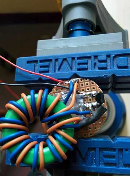 El toroide tiene 4 cables con orrange y azul en cada extremo. Ahora soldar un extremo (final) del cable naranja con el resistor de 1K.