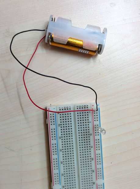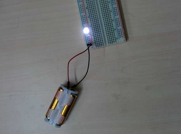 Primera verificación a luz un led usando una sola batería. Lo siento :(no va a funcionar como requerir una cierta tensión mínima para encender. Un LED normal requiere 1.85V y un LED de potencia requieren 3.5V o más para encender.