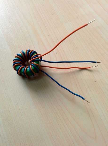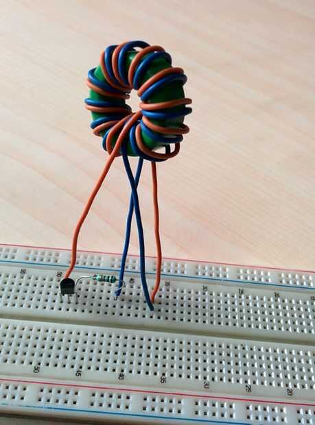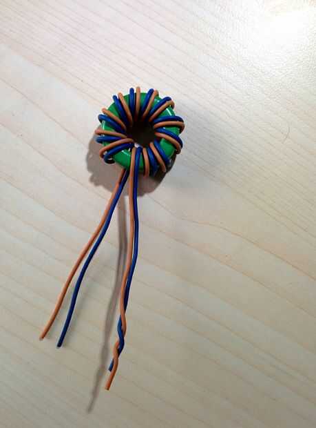 Tome un hilo de un color específico (naranja) en un lado de la toroide y un cable de otro color (azul) en el otro lado de la toroide y colocarlos juntos en el tablero de pan. Estos dos cables forma la parte superior de la toroide como en el diagrama de circuito y conectado al borne positivo de la batería. Esto se hace para conectar dos bobinas en la polaridad opuesta del punto (véase puntos en esquemas).
