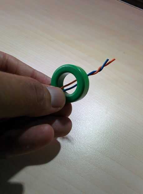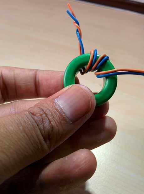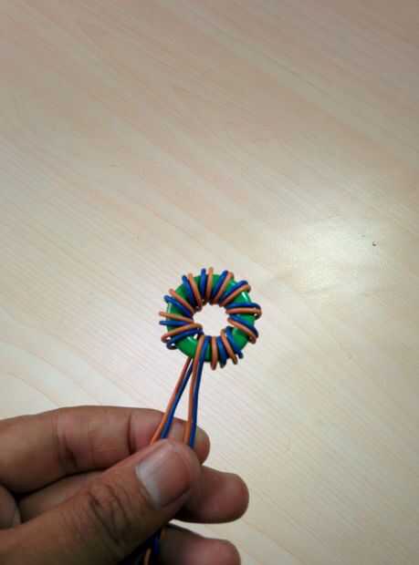 Mantener los dos cables juntos y enróllelos alrededor del toroide hasta que han cubierto el toroide todo.