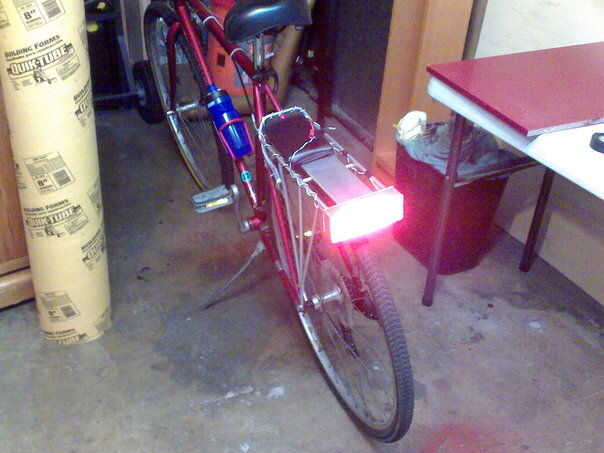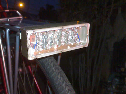 Esta compilación es realmente fácil. Encontrar una caja de metal sobrante, lo de la tripa, cortar una tapa de plástico y pegamento en las tiras de LEDs. Por supuesto primero tienes que encontrar las tiras de LEDs, o hacer una PCB etc.. En cualquier caso, es una caja con LEDs, un conductor actual de Taskled CC1W y eso es todo. Personas me han dicho que mira como si estuviera en fuego. Tan brillante como la luz del freno de muchos coches y en su amplia dimensión se distingue de la mayoría de los pilotos de moto. También tengo esta corriendo fuera de la Ryobi batería de 18 voltios.