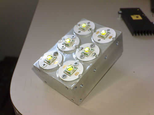Alineación de los LEDs es fundamental. Los lentes cuadrados que utiliza son casi 1 pulgada cuadrada. Esto significa que hay poco margen para el error en la alineación de los LEDs. Cuidado diseño con un sistema de pinzas debe proporcionar adecuada alineación. Esto es otra característica útil de la scrwes, como mantienen los LEDs en la alineación mientras que las curaciones de epoxy.