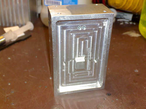 Usé una fresadora de mesa del puerto de carga para el difusor de calor de la forma. No salió perfectamente pero salió bastante cerca y con el uso de tornillos en el lado de la caja, funciona bien.