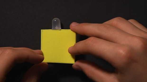 lista de piezas:-Batería de 9VLEDPequeña PCBInterruptor de botónResistencia de 1KBanda de gomaHerramientas:-Soldadura de hierroDe la soldaduraPaso 1: conexiones Las conexiones son muy sencillas y requiere muy poco de soldadura.Paso 2: Montaje Final C