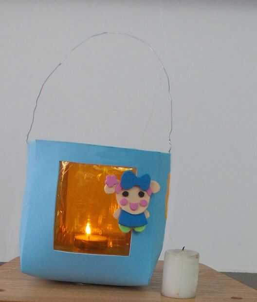 Inserte el cable de zinc en los 2 extremos de la linterna para sostenerlo. Poner la vela de té-luz de la linterna y grabarlo. Hecho.
