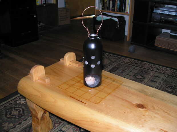 Mejoras potenciales--(1) conectar la tapa con metal y taladro un ducto de escape del agujero en la parte superior hacia delante, para que la luz NO conseguiría en los ojos a perder visión oscura. (2) usted también podría elegir un patrón de orificio de ventilación más creativo, como un dragón, muchos agujeros con una broca pequeña, o utilizando una herramienta Dremel. (3) pensar la manija mejor; Esta fue una solución precipitada. (4) pulimento al pintura spray sobre interior con lana de acero y volver al interior (o mejorar) para un alto brillo para reflejar más luz nuevamente hacia afuera. (5) finalmente, puede hacer la botella más estable, girando sobre una base más amplia (Plaza para evitar el balanceo y derramando vela hacia fuera).