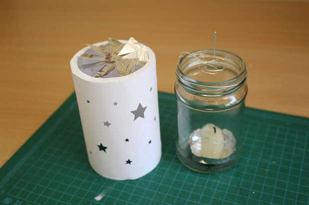Luego poner la vela en el vaso, poner el pivote de alambre en la jarra y encienda la vela. Por último, poner la linterna en el pivote de alambre. Se hace!!