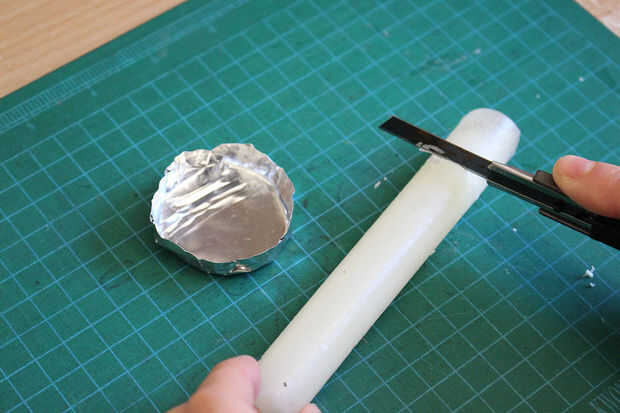 En segundo lugar, utilizar siguen siendo tartera de aluminio para hacer una placa para la vela, y corté la vela a la longitud necesita.