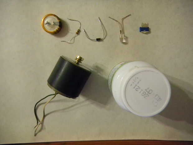 1. una botella de plástico pequeña. Mina es un contenedor de pastillas de vitamina C. Es lo suficientemente grande como para acomodar un motor de DC y otras partes.