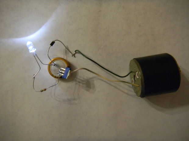 La soldadura de las piezas según el esquema. Asegúrese de que el interruptor está apagado. Girar el eje del rotor con el pulgar y el dedo índice. Ser paciente. Toma unos minutos para cargar el condensador estupendo. Encender y comprobar cuánto tiempo funciona.