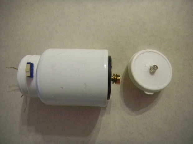 Retire la etiqueta y la grasa de la botella de plástico. Hacer un agujero en la parte inferior. Usé un alambre eléctrico caliente y un archivo para hacer el trabajo, pero se puede perforar. El diámetro debe ser igual al diámetro del cuerpo del motor de la CC. Hacer una derecha del agujero en el centro de la tapa de la botella (5mm de diámetro para introducir el LED). Usé un clavo caliente para hacerlo. Hacer 3 agujeros pequeños en el cuello de la botella para instalar el interruptor. Usé un pequeño clavo caliente para pinchar los agujeros. El recinto está listo.