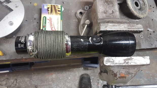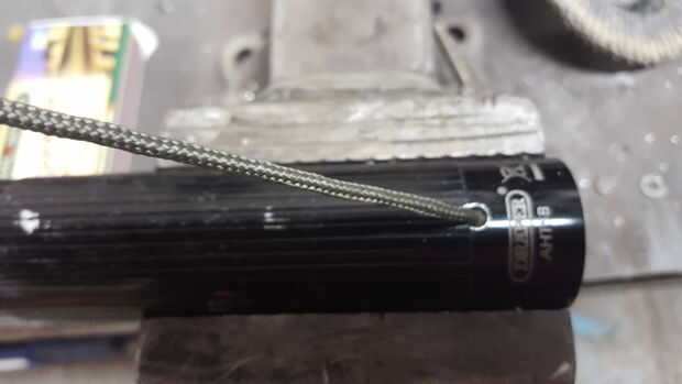 Taladré un agujero de 5mm en el cuerpo de la linterna y pasado el paracord a través, luego ató un nudo para detener el cable tirando hacia afuera. Envuelve el paracord alrededor del montón antes de atar el cordón de.