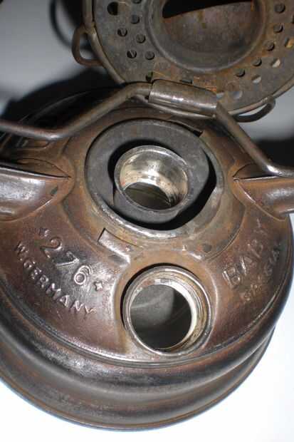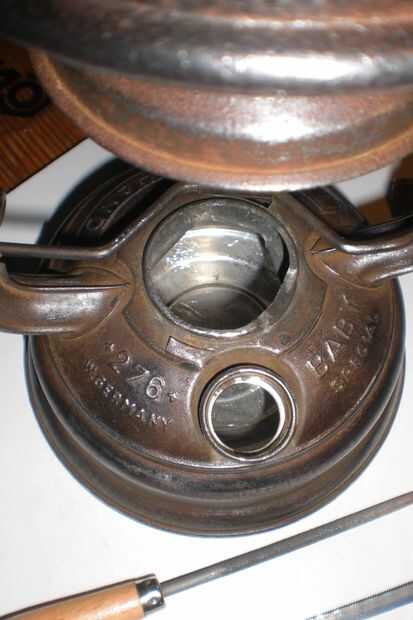 En este paso tenemos que preparar el depósito para la instalación electrónica. Primero tenemos que desactivar el elemento del quemador. Ahora vemos que el agujero es muy pequeño. Para hacerlo más grande que tenemos que cortar el anillo pequeño con unas pinzas. Entonces usé diferentes archivos de metal (una redonda y triángulo uno) para cortar la hoja de metal interna cinco veces. Después de este trabajo usted puede empujar las piezas lata cuidadosamente con los dedos dentro del tanque. Ahora el agujero es grande enaugh para los componentes electrónicos.
