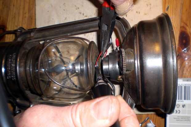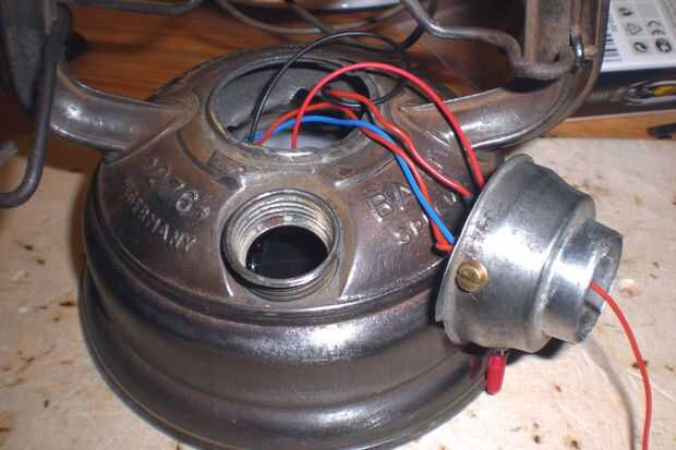 Ahora usted puede llenar el tanque con el aislamiento electrónico, cables y soporte de la batería. Enroscar el anillo con el interruptor y poner el globo de cristal en su soporte. Luego enroscar la bombilla vela y soldar el cable rojo del circuito de voltaje alto a contacto de th inferior del bulbo.