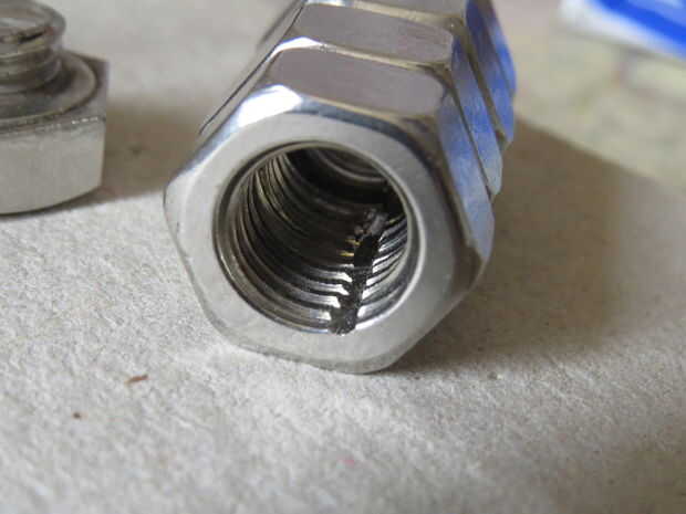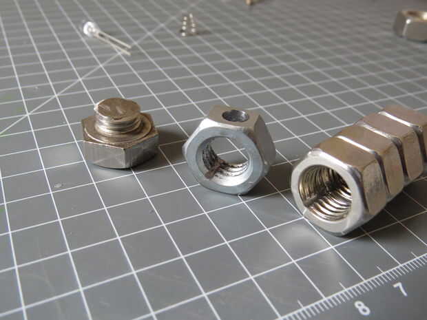 Vio una ranura pequeña 2-3mm en el interior de cinco de las tuercas (incluyendo la tuerca del interruptor). Utilicé una sierra de mano metálica regular para hacer esto. El propósito de la ranura es permitir que un alambre pasar a través del compartimiento de la batería sin bloqueo, por lo que los surcos deben toda la línea hasta uno con el otro.
