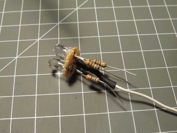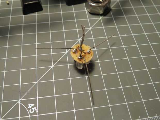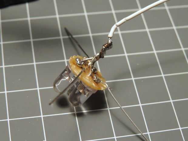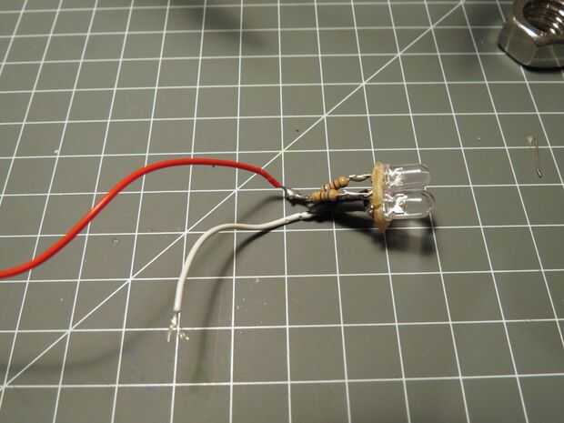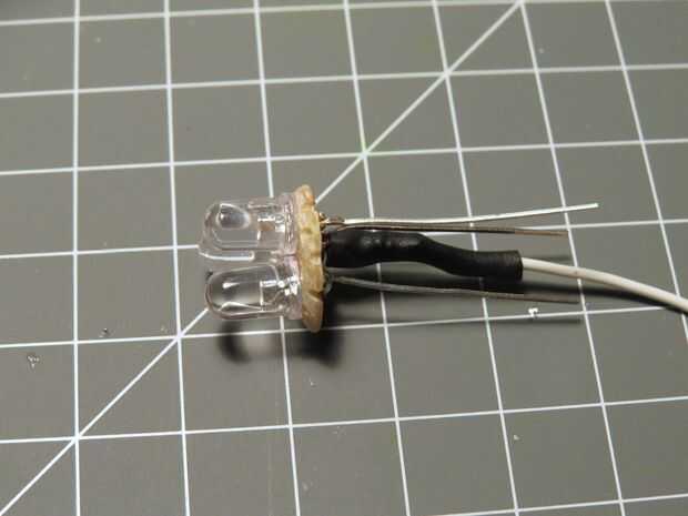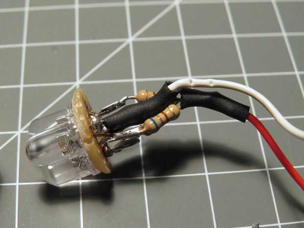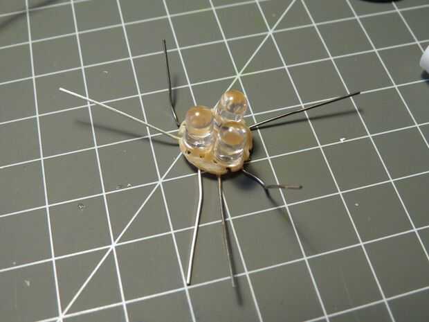 Meter los tres LEDs a través del disco como se muestra arriba y doblar las puntas hacia afuera para mantener en su lugar. Compruebe que lleva es los ánodos y los cátodos que son. Soldar los cables para el perfboard y trence los tres cátodos (negativo, más corto conduce). Les de la soldadura a un alambre y envolver en la tubería del encogimiento del calor. Los restantes tres conductores positivo a 5mm y se les de la soldadura a un resistor de 680Ω cada. Tuerza los extremos de las tres resistencias y soldarlos con otro cable. Envuélvalo en algunos para el aislamiento de la tubería del encogimiento del calor.