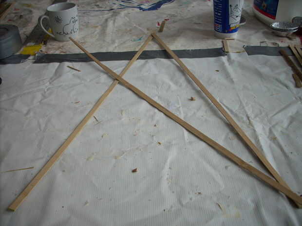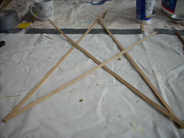 Ahora que han cortado sus diez piezas de bambú no van a arreglar como una estrella. Tomar 5 de sus 10 piezas (las otras 5 son para el otro lado de la estrella) y comienzo poniendo que hacia fuera como las imágenes han demostrado. Contar con la luz granulada color lateral del bambú hacia arriba.
