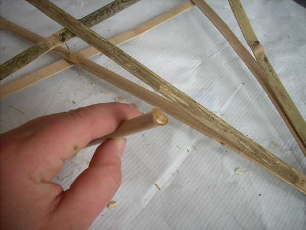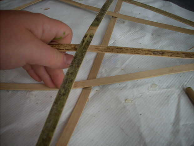 En primer lugar, tomar el bambú redondo y cortar una longitud que determina la profundidad de la linterna. En este ejemplo elegí hacer 4 pulgadas. Yo recomendaría un tamaño que está dondequiera entre 4 a 5.5 pulgadas. Necesitas 5 de estas piezas.