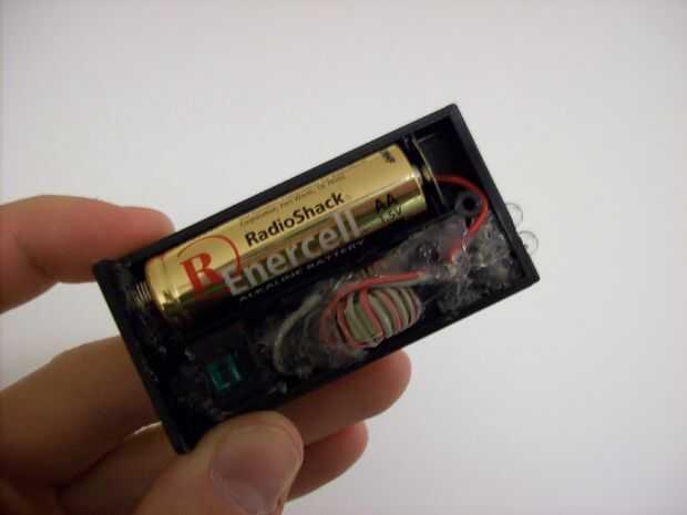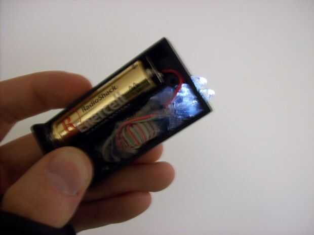 En primer lugar, me llevó el caso de AA doble estándar radio shack y quitado el terminal (-) y la placa trasera. Pegué el terminal donde la placa fue y caliente lo había pegado en lugar. A continuación la toriod la herida, soldar los LEDs juntos en paralelo, soldar todo junto y había montado en la caja en la otra ranura de la batería AA. Por los agujeros del corte en el caso de mi dremel los LEDs y el interruptor de empujar hacia fuera muy bien. Después de todo entra en, sellé en lugar con un montón de pegamento caliente. El pegamento que mantiene todo de mover y de cortocircuito.