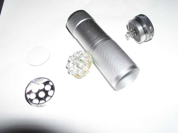 En primer lugar, tenemos que tomar la luz aparte. Desenrosque la tapa y retire el soporte de la batería. Con un destornillador o pick, saque el plástico de la "lente" que cubre los LEDs en el otro extremo. Es normalmente sólo encajan en el cuerpo. Seguir apalancando hacia fuera el plástico reflector. A veces un resorte de alambre clip se utiliza para retener, si es así tire primero. Puede empujar la Asamblea entera de la lámpara hacia fuera con un destornillador u otro objeto por simple empujando hacia arriba a través del área de la batería. Si el conjunto LED todavía tiene el reflector conectado, retire. Ahora debe tener unas pocas piezas: tubo del cuerpo principal, w/clicky interruptor de batería final tapa, tablero de LED, reflector. La lente puede ser sacudida.