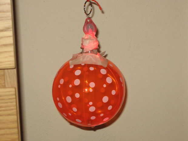 Cinta quema final del cuello de la botella a la bola.  Mi hija utiliza cinta de papel.  Cinta Scotch sería buena, también.  Lo ideal es utilizar una cinta que saldrá la bola sin daño.  La cinta no será muy visible una vez que las luces de la habitación están apagadas y el LED está encendido.