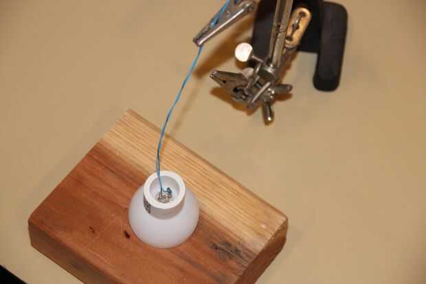 Vamos a utilizar pegamento caliente para encapsular las piezas de la lámpara. Esto proporcionará un sello hermético para la bola que lo ayudará a mantener su forma si se golpea. Esto también proporciona aislamiento para nuestras conexiones y actuará como un alivio de tensión para nuestro espiral de alambre, así como mecánica conecta el anillo de montaje a la bola.