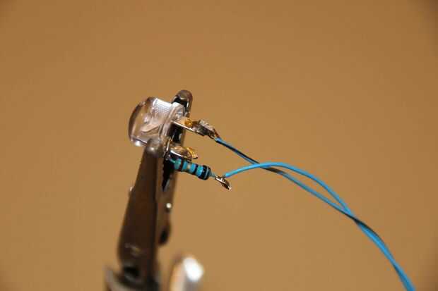 Una tercera plantilla de mano es muy útil para los pasos siguientes. Su resistencia de limitación de corriente de soldadura para el ánodo del LED (conexión positiva) esta será la cabeza de LED más. Soldar un cable de par trenzado de 12 pulgadas para el LED / Asamblea de la resistencia. Anote el código de color para las conexiones positivas y negativas. Revíselo con cuidado para cortos.