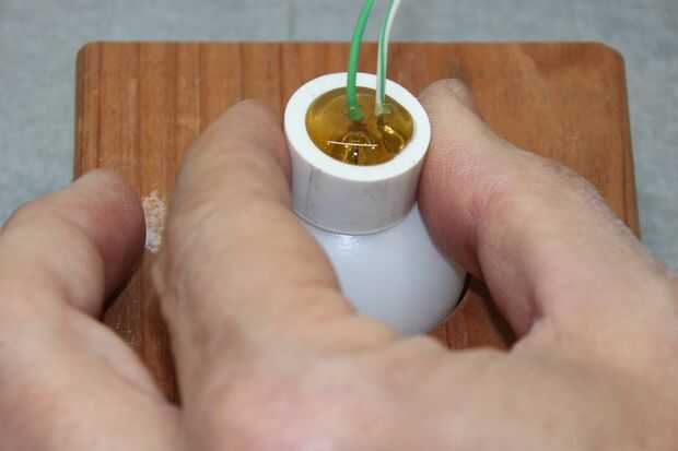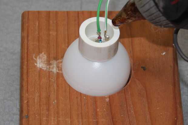 Inserte el ensamblaje de LED en el orificio de la bola. Asegúrese de que tener un ajuste apretado. Si tienes lagunas, pueden llenarse con un pegamento tipo gel. Deslice una 1/2" PVC tubo sobre los cables y apoyarla en la bola con el LED en el centro. Tratar de apoyar la bola LED y cables por lo que mantienen una alineación centrada. Suavemente Sujete el anillo de montaje de tubería de 1/2" en su lugar y llenar el interior con pegamento caliente. Continúan manteniendo suavemente el anillo del tubo en lugar hasta que el pegamento empiece a establecer. No presione hacia abajo el anillo de la tubería. Esto forzará el aire fuera de la bola y después el pegamento fija tendrá una lámpara con un lugar plano.