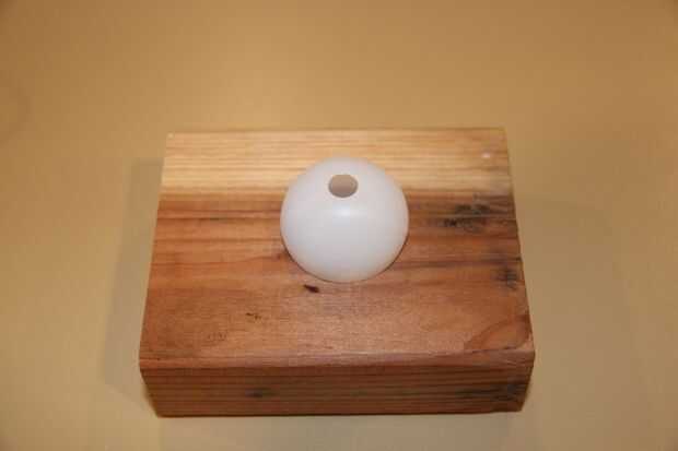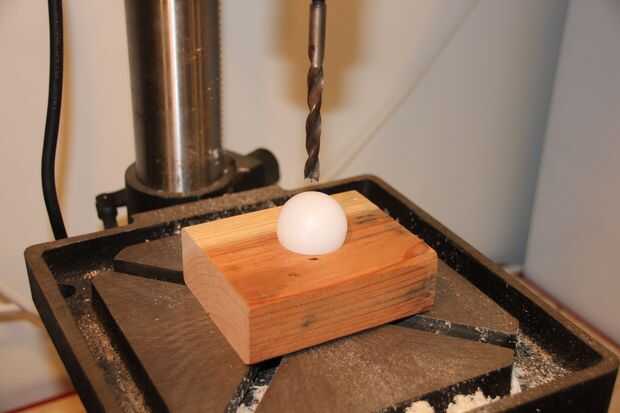 Construí un soporte de bola de un trozo de 2 X 4 con un 1-3/8" agujero perforado en él. No se requiere, pero hará su vida más fácil. El taladrado del LED en la bola es un poco complicado. He encontrado dos maneras que funcionan bastante bien. Lo mejor es utilizar un brad de 5/16 punto de broca a una velocidad bastante alta (3000 rpm) esto hará un orificio limpio y los residuos de perforación pueden ser quitado con un par de alicates de punta. Un Unibit también funciona bien, pero el agujero puede necesitar un corte con un cuchillo Xacto. Desea el LED para ajustarse perfectamente en el agujero. Si no sellar el agujero completamente, pegamento caliente escurrirse en y arruinar su lámpara.