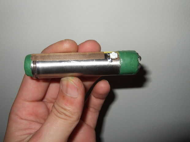 ahí estaba, con una batería de 3 voltios cámara en una mano y un LED blanco en el otro. Era bastante obvio lo que planeé hacer. Se reunieron algunos materiales adicionales y me fui a trabajar. Dentro de un par de minutos, tuve una linterna y en algun