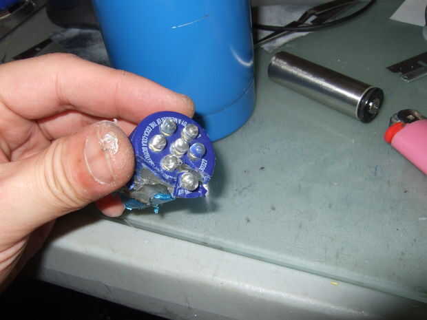 Con la ayuda de un cuchillo del exacto calentada por el soplete de propano, quitar los LEDs no demasiado duro. Se utiliza una gran cantidad de grasa de codo, seguro. Pero en mi frenesí de rocío de la montaña alimentado modding, no podía dejar de comprar otros nuevos.
