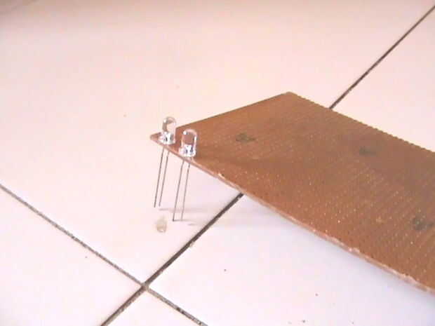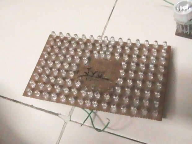 Poner LEDs de 5mm en el PCB y pegar en el tablero. He utilizado fevicol ya que es barato, y se seca para ser transparente. Recuerde dejar algún área en el centro de la placa de circuito para montar el disipador térmico y la LEDs de alta potencia. Una vez que han pegado los LEDs de la placa de circuito, entonces usted debe tener algo que se parece a la segunda imagen siguiente.
