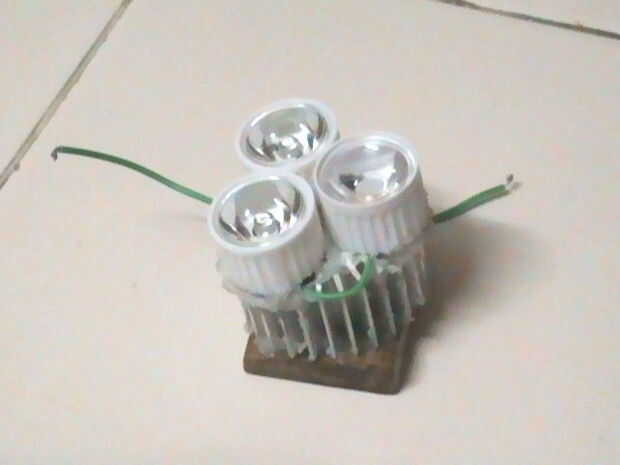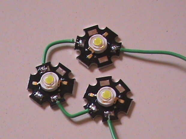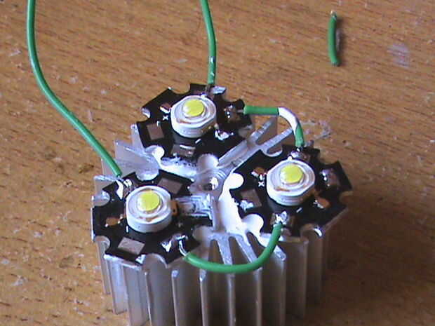 Miedo oír la palabra 'Tridente'? No tengas miedo. Sus solamente tres LEDs de alta potencia. La soldadura de la alta potencia tres LEDs en serie como se muestra en la segunda imagen. Aplicar algún compuesto térmico en la parte posterior de los LEDs y usando el silicio sealent péguelos sobre el disipador de calor.