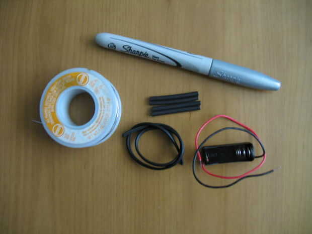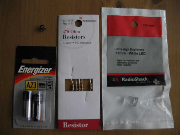 Tubo de ChapStick Interruptor táctil A23 Batería (12V) Resistencia de 470 Ohm LED de 10mm blanco (28, 500mcd, 20mA, 3.5V) De la soldadura Tubería del encogimiento del calor Alambre Soporte de la batería "N" J-B Weld