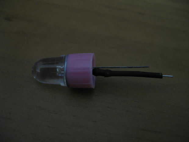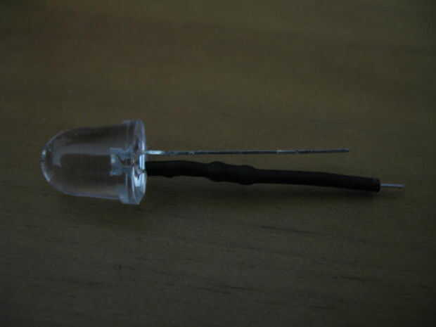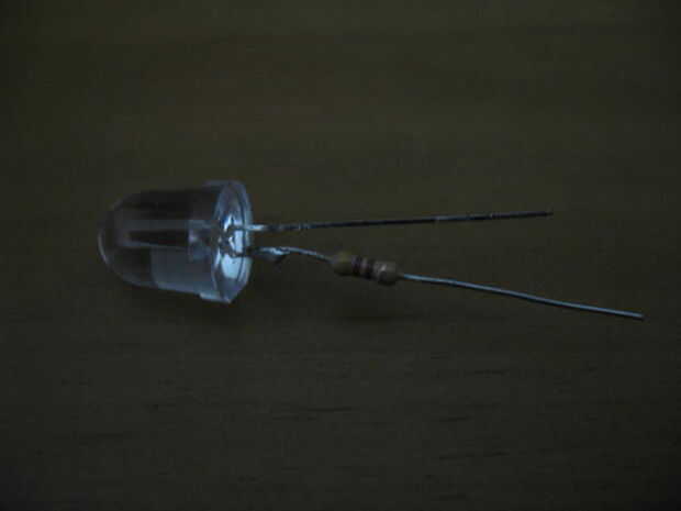 Cortar el cable negativo del LED a 1/4" y suelde la resistencia a él. Algunos encima de la tubería del encogimiento del calor del encogimiento y poner ambos conductores por la parte superior de la plataforma de ChapStick.