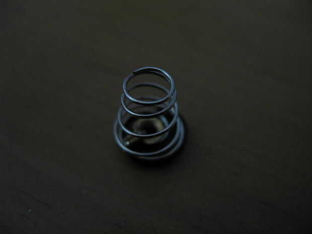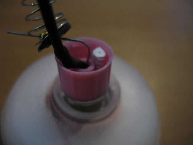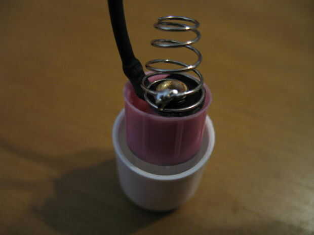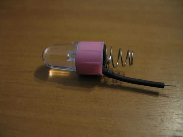 Corte el resorte del soporte de la batería de "N" (dejando la parte plastica se une a intacto) y corte una sección de 1/4" de la parte inferior del ChapStick. Inserte la sección de 1/4" en la parte inferior de la plataforma, (esto le ayudará a hacer más estable la base de la primavera. Deslice el positivo del LED a través del centro de la primavera, soldadura a la base de la primavera y luego enganche cualquier porción restante del plomo apagado.