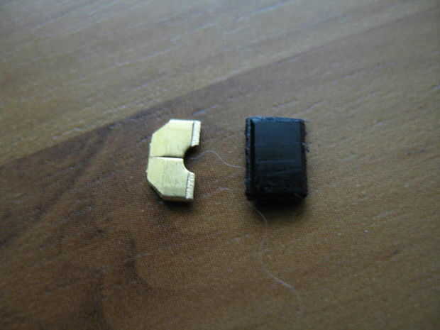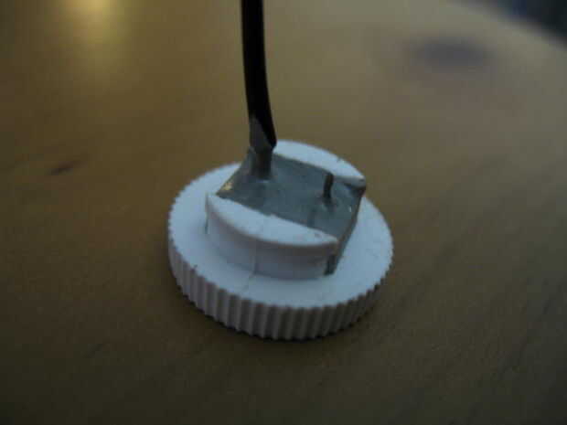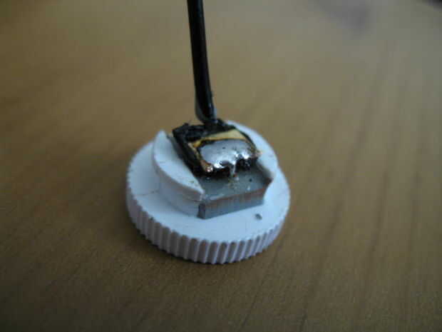 Raspar cualquier soldadura J B restantes de las terminales del interruptor táctil y un trozo de alambre a un extremo de la soldadura. En el cuadro demostrado, había soldado el cable antes de poner J-B Weld sobre el interruptor, pero de cualquier manera va a funcionar. Cortar una pieza de plástico del soporte de la batería de "N" (o cualquier otra cosa que tienes ahí) y una pieza de metal (yo usé un conector de terminal) para soldar el otro extremo del interruptor táctil para. (En realidad puede utilizar la parte inferior del soporte de la batería de "N" para esta parte. Echan a mina en el primer intento así que se ocurrió esto.) La pieza de plástico en el centro de los conductores del interruptor táctil, de súper pegamento (Esto evitará que la base de que la batería se encuentra en tocar al otro lado del interruptor táctil.) El pedazo de metal en lugar de la soldadura. (El plástico probablemente se derrita un poco, pero asegúrese de no impide que la parte inferior de la batería que hace contacto con la porción del metal.)