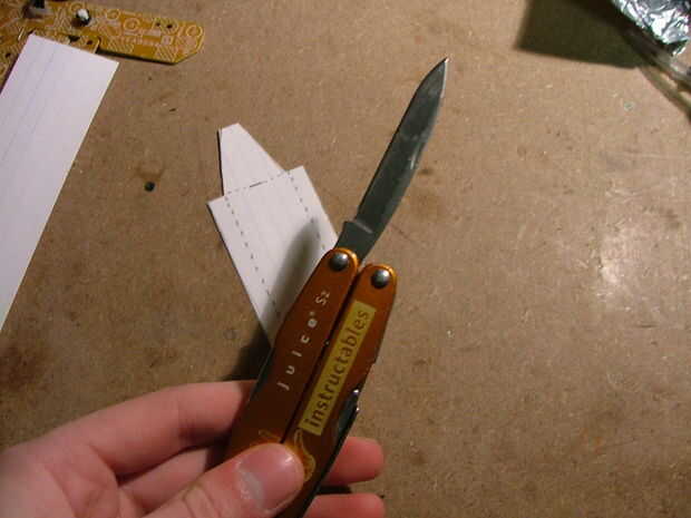 Ahora, usando el cuchillo de la Instructables Leatherman, puntuación pero no corte a lo largo de las líneas discontinuas. Esto hará que dobla la tarjeta mucho más fácil.