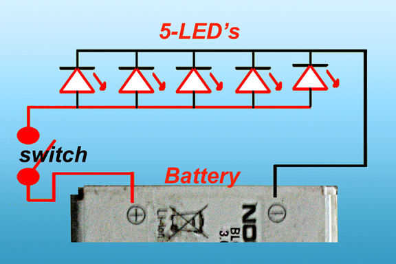 Todos los 5 LED está conectados en paralelo con un interruptor de la batería.