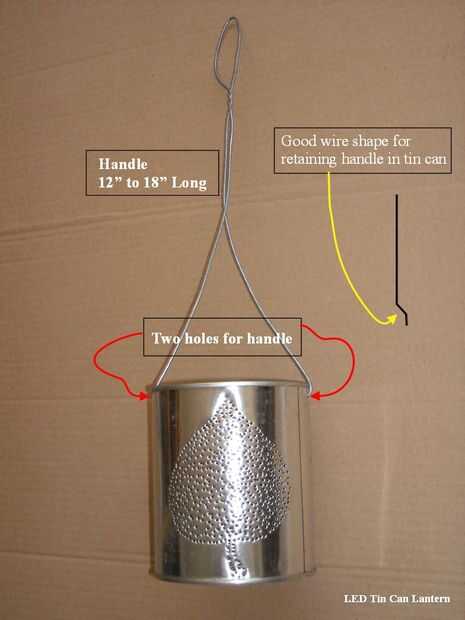 El mango para colgar la lámpara de LED de lata puede ser de un gancho de metal o alambre tipo sólido de calibre 18-16. Perfore dos agujeros en la lata para la ayuda. Ver el cuadro para la referencia.