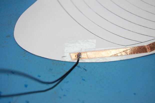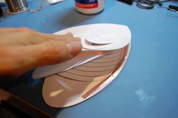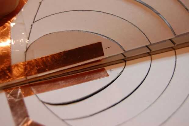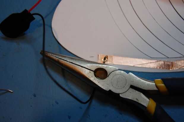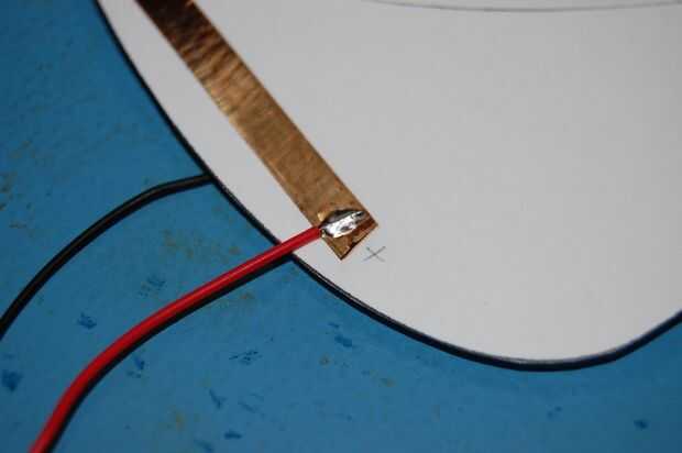 Ahora se pueden soldar los cables de batería en. Decidir que trace debe ser positivo y el cable positivo (rojo) de la pinza de la batería en el final de la traza de la hoja de cobre de la soldadura. Marcar con lápiz si lo desea. Luego, soldar el cable negativo (negro) sobre la traza de cobre opuesto. Asegúrese de no utilizar excesivo calor o se quemará el papel. Y, no de la pila en una enorme gota de soldadura ya sea, o seguirá siendo una protuberancia visible cuando pegan. Aplique una capa de cinta aislante sobre una de las juntas soldadas (probablemente la parte que ya está grabado)